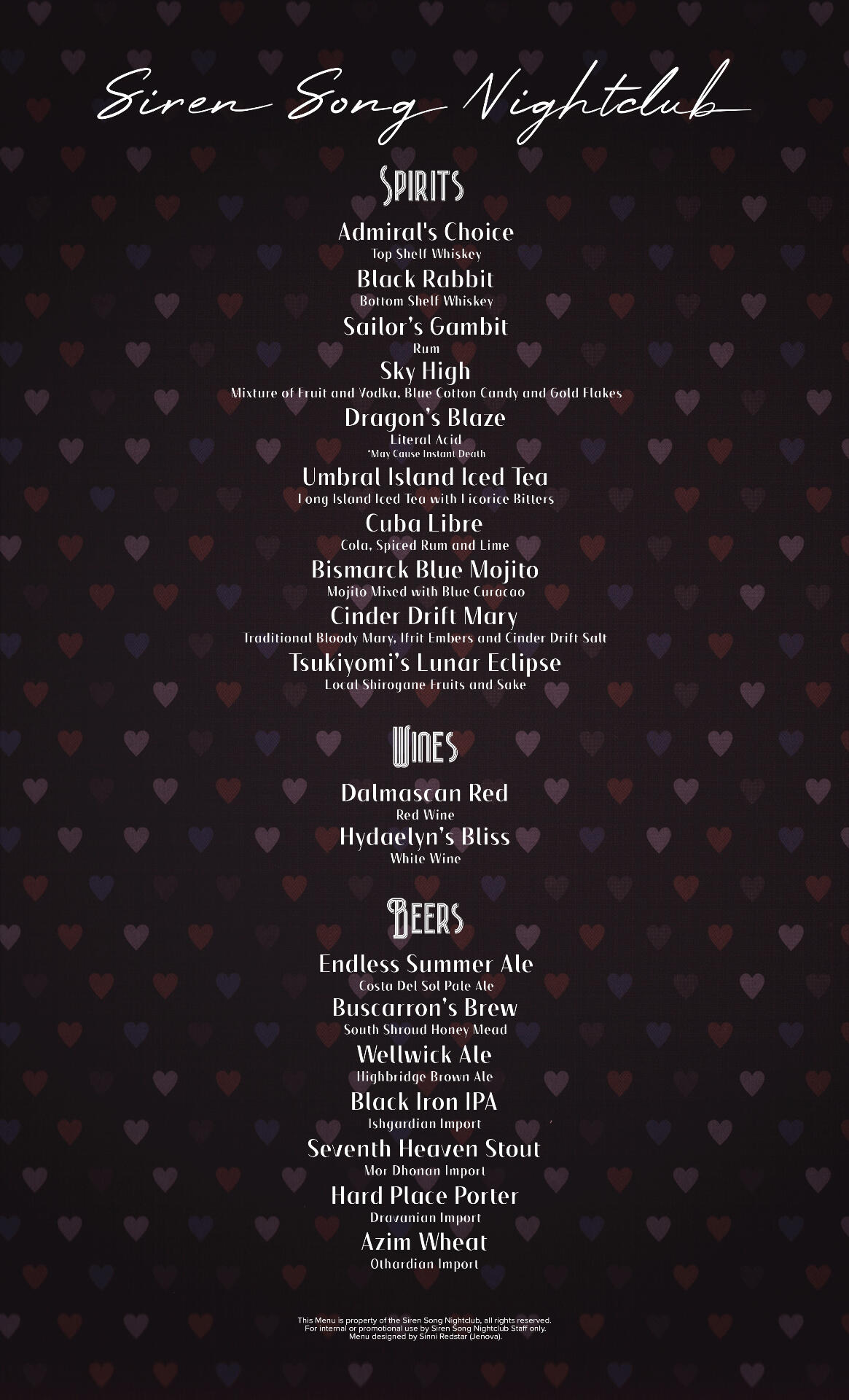 Adamantoise Shirogane Ward 9 Plot 33Open Sat & Sun 8pm-12am EasternAs workers and family, the Siren's Song prides itself in putting your entertainment first and foremost. Inviting one and all to simply relax, play, or partake to your heart's content from the simple to the vibrant, splendors of life.We invite you to come visit us and relax in our lounge or at the bar, where our special line of signature beverages are always on the house. Strike up a conversation with one of our lovely lads or ladies, and maybe even take them off for some private time.